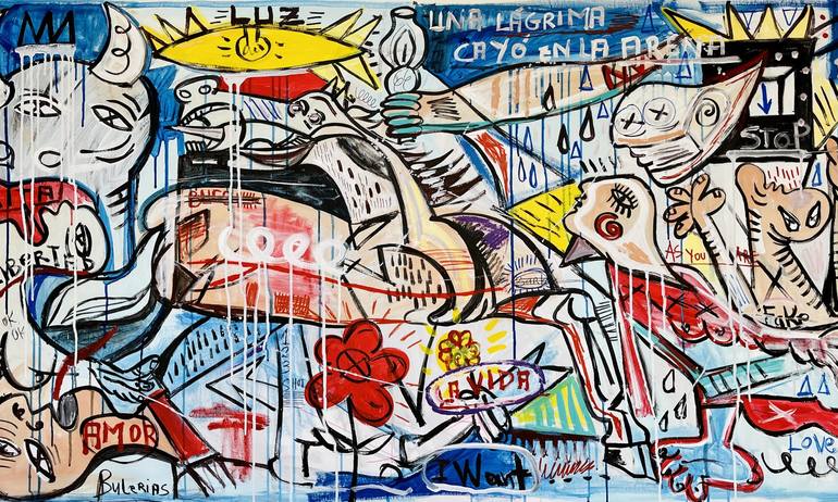 Pop version of the famous Picasso’ artwork Guernica. Unstretched. Extra canvas for stretching.