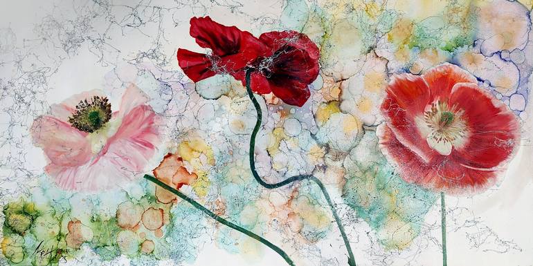 One of the paintings from the series "Over the Abyss"- Poppies. 2017 g. Easy spring oil painting with elements of alcohol ink and spray