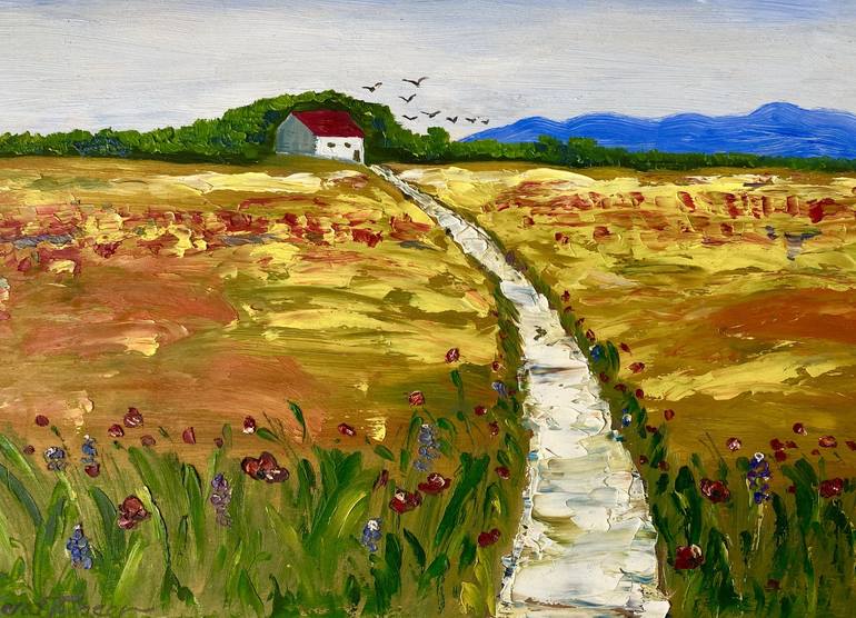 Province Red Poppies on yellow field with different wild flowers. Oil painting with texture, painted on wood. This beautiful painting could be a great present for someone's birthday or just a gift for your friends and family. It looks nice in living room, or dinning room or where you decide ...