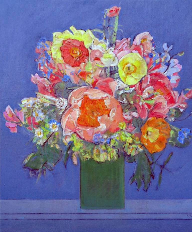 A beautiful bouquet of poppies in a vase on a shelf in the studio.