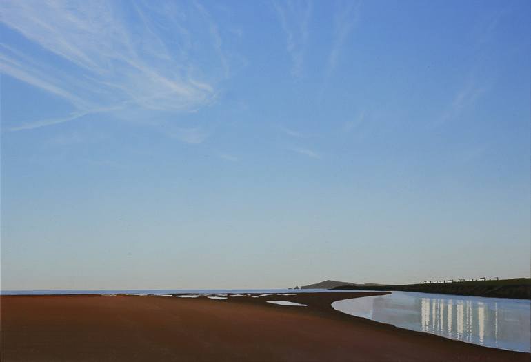 This landscape was inspired by the estuary beach at Poppit Sands in Cardigan Bay. It is the end of the day and lights from the houses on the cliffs are reflected in the estuary of the river Teifi. The aim was to capture with sensitivity the atmosphere of the subject using various techniques in acryl...