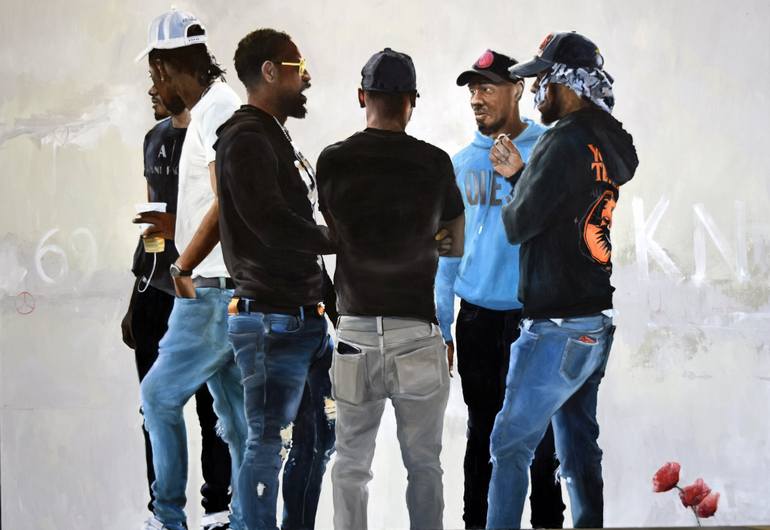The painting is a result of my desire to deal with more than the single figure as I usually do. The intention is to create a narrative which results from the interaction of a group of people. The painting is intended to challenge the preconceptions we might have about encountering a group of young m...