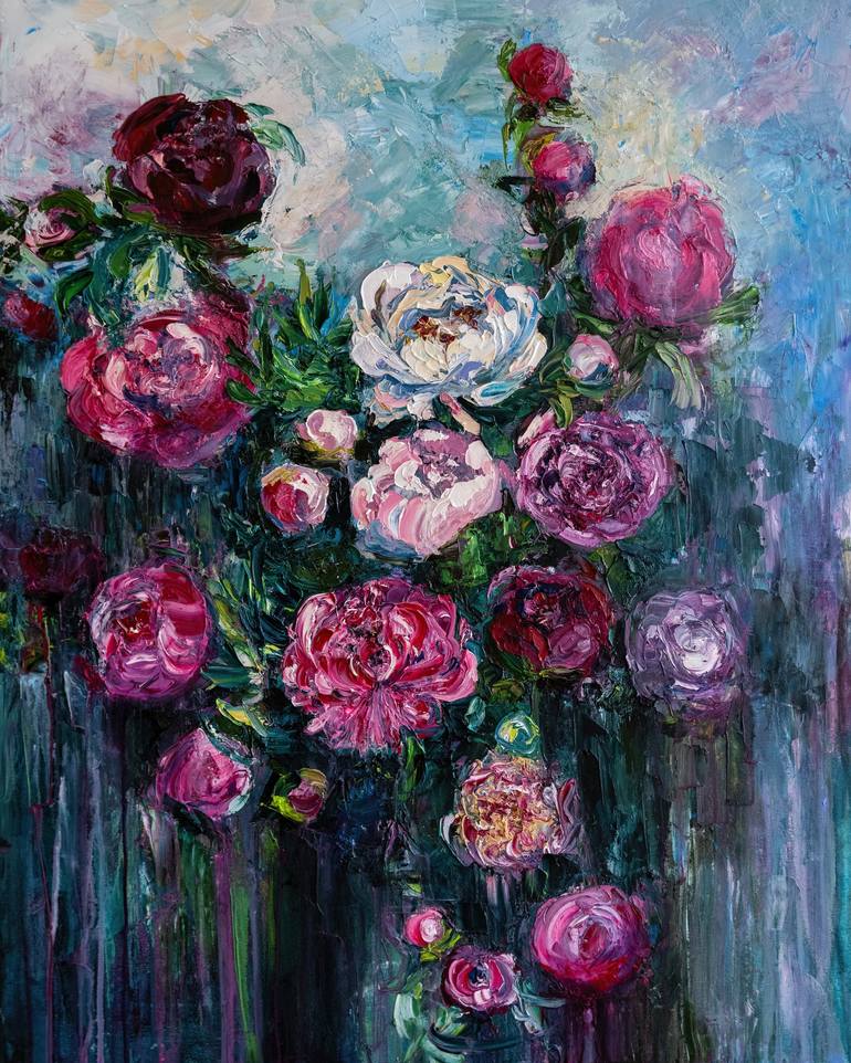 Portal of Peonies Size: 100x80cm Oil, canvas 2022 100% handmade oil painting on canvas The canvas is stretched on a stretcher frame The edges painted, allowing it to be hung without a frame It will be packed in a cardboard box for safe transportation. This is one of my impasto pieces, created enti...