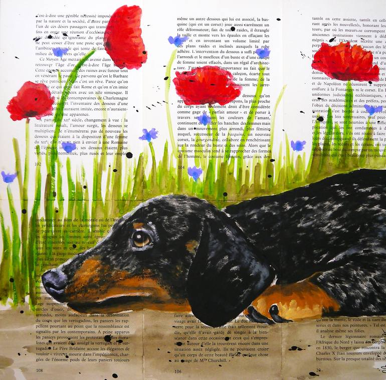 Portrait of a Dachshund dog. Hide and Seek Technique: oil, acrylic, glue, ink on old book pages on wooden frame 40x40cm ■■ 15,7 x15,7inch ⭐Sustainability⭐: Wooden frame is made by the artist by recycling old books. In an ecological approach, each packaging is tailor-made and is itself from a recy...