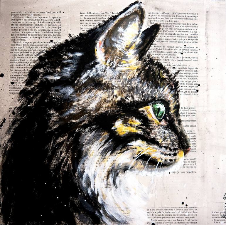 Fantasia Fauve Closeup portrait of a cat. A side view of a cat who is dreaming to be a tawny! Technique: oil, acrylic, and ink on old book pages on wooden frame 45x45cm ■■ 17,7x17,7 inch Sustainability: Wooden frame is made by the artist by recycling old books. In an ecological approach, each p...