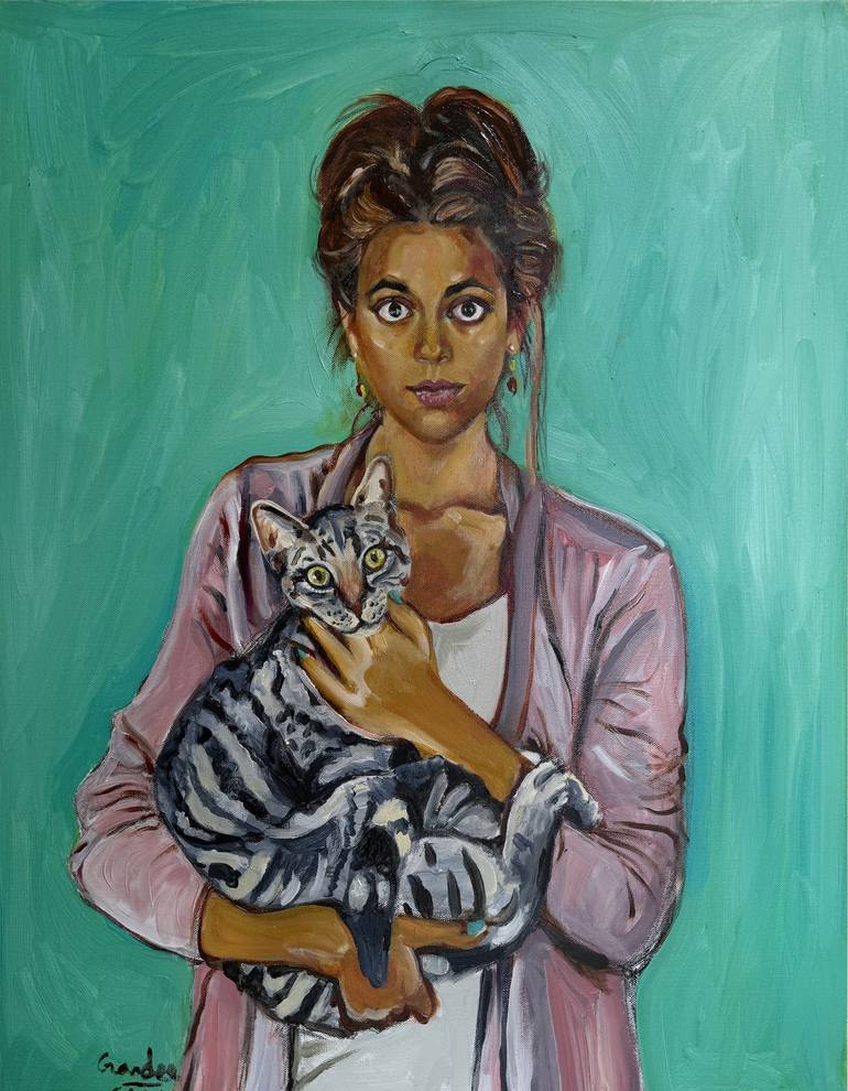 This is a portrait of my daughter Veena with our cat Sylvester. Veena's eyes are very striking, almost like those of a cat and I wanted to capture the parallels as they are both staring out of the canvas. I am trying to convey the bond between my daughter and her cat. There is a captivating, silent ...