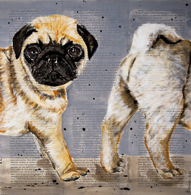 Where is my body? 03 Portrait of Pug dog . Technique: oil, acrylic, glue, ink on old book pages on wooden frame 40x40cm ■■ 15,7 x15,7inch ⭐Sustainability⭐: Wooden frame is made by the artist by recycling old books. In an ecological approach, each packaging is tailor-made and is itself from a recy...