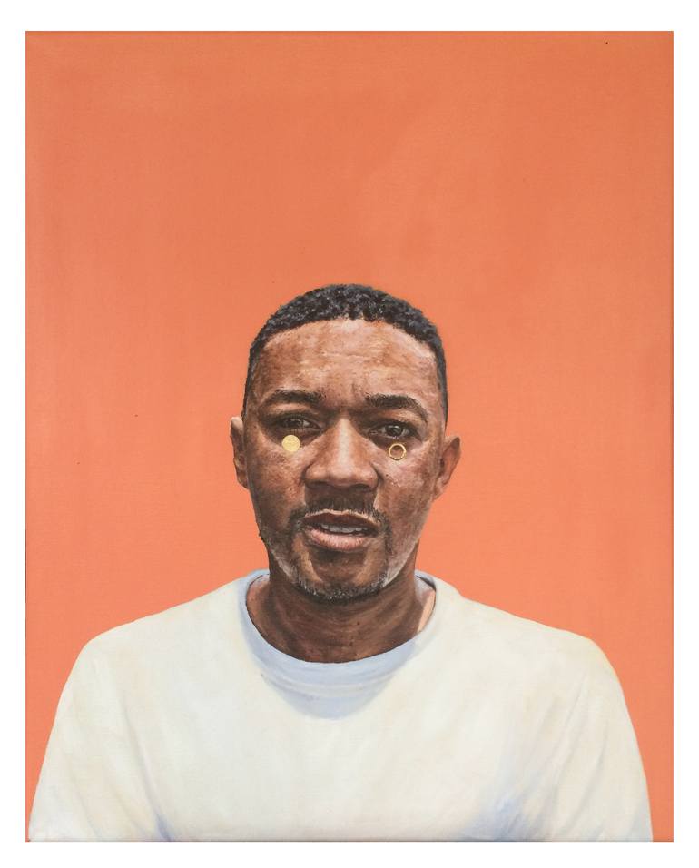 This painting depicts a enigmatic subject staring straight back at the viewer. The expression poses questions to the viewer and challenges them. The gold leaf discs below the eyes are real 24-carat gold leaf. They are inspired by Byzantine art and their use of gold to adorn idols. These take the...