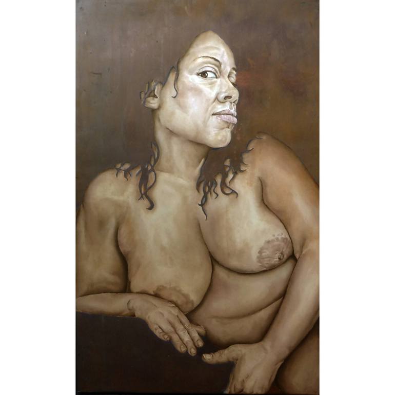 A portrait of a nude woman. Painted in oil on copper that has been wrapped around a wooden panel.