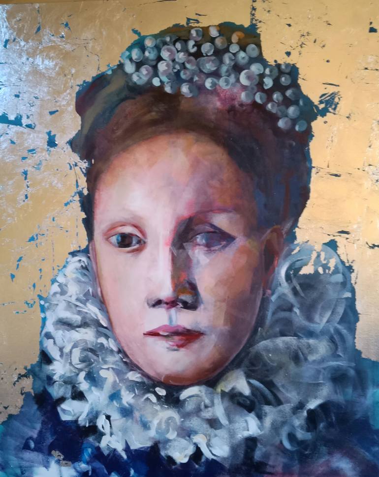 My work is a portrait that combines emotional intensity with an acrylic and silver leaf technique. The lady's gaze reflects deep introspection and dignity, capturing the essence of the human spirit. This painting will not only beautify any space with its figurative style and richly crafted texture...
