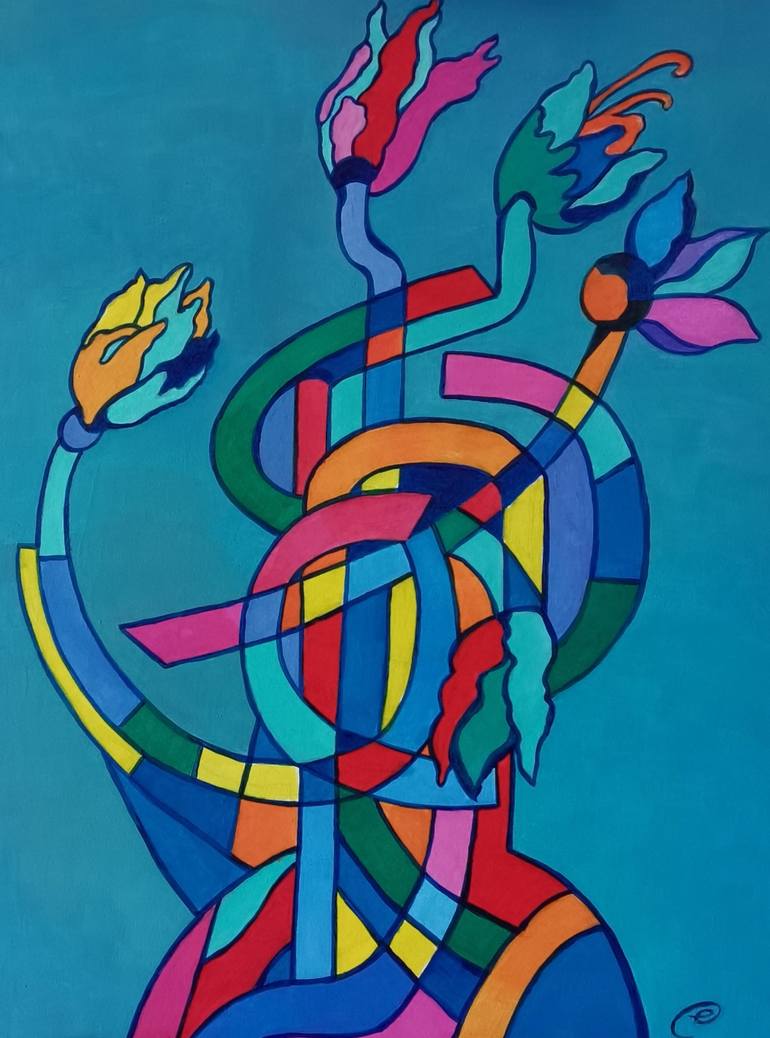 This abstract portrait is inspired by the beauty and complexity of a man's life. The artist used flowers and geometric shapes to express the depth and diversity of human experience. The blue background symbolizes calmness, contrasting with the bright colors that represent life's energy and emotions....