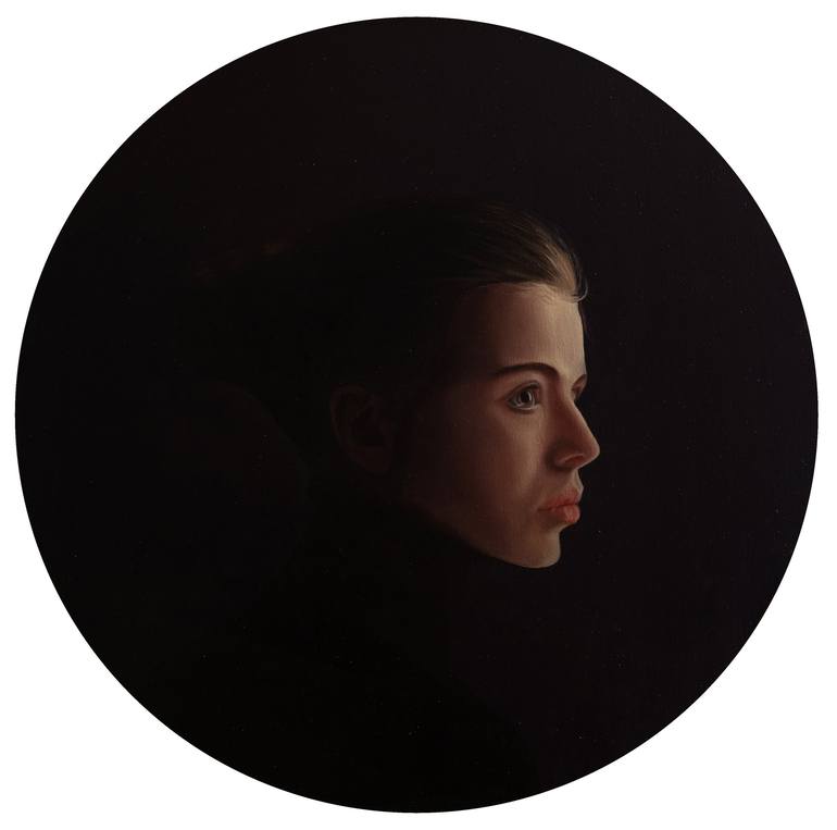 A woman portrait "alla prima" made during the uncertain period of the pandemic. The canvas is round (60cm diameter)