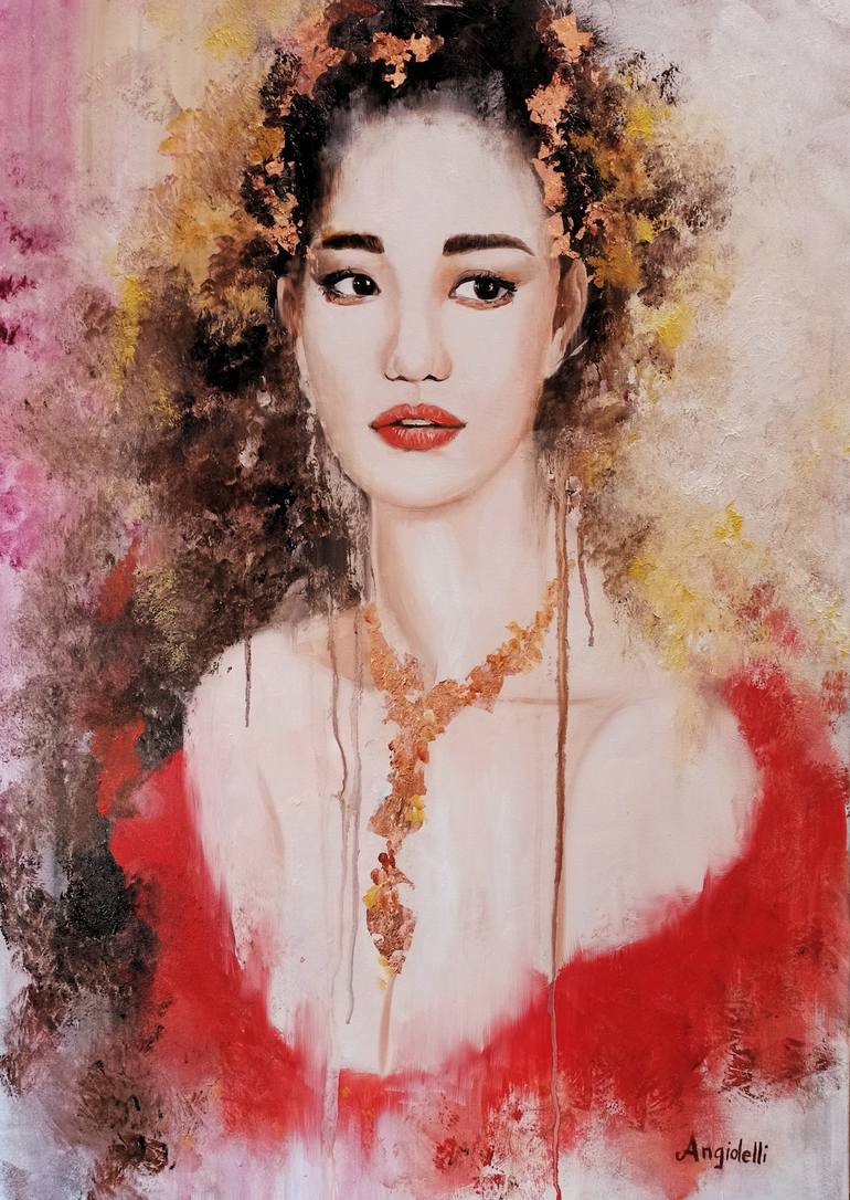 Portrait of a young woman with oriental features made with mixed technique, with oil colors, acrylic colors and with the insertion of gold leaf that gives light reflections to the composition - painting on canvas measuring cm. 50 x 70 cm - signed on the front and colored also on the edges, it can al...