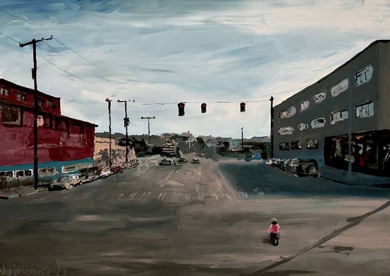 A small child on a bicycle moves alone into a broad intersection under a sky suspended with red traffic lights - each glowing with silent authority. The cityscape is rendered in broad, gestural strokes, blurring detail and dissolving hierarchy. Architecture becomes suggestion; the only clarity belon...