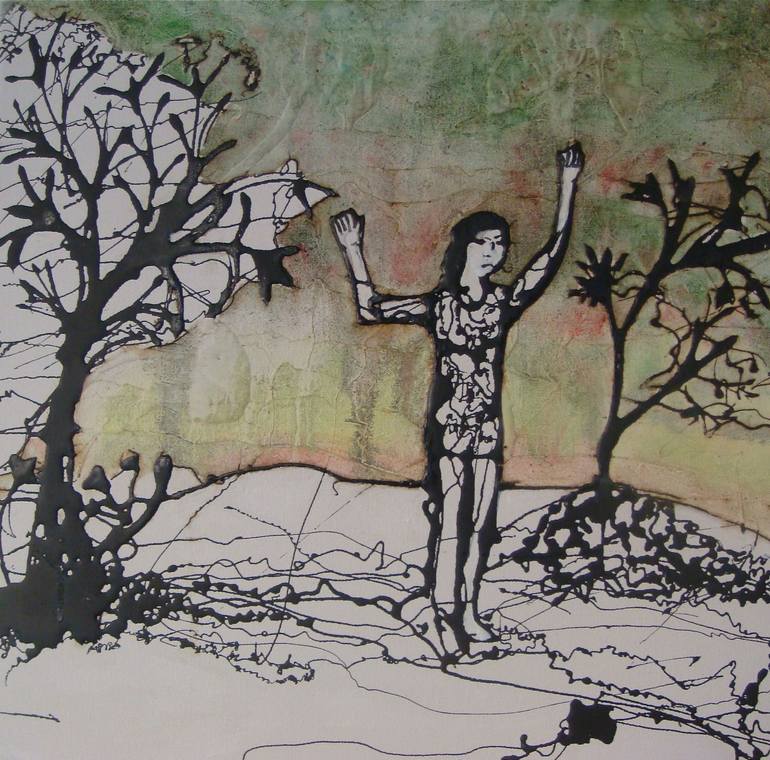 Over the last 10 years I have dripped bitumen paint on to canvas, creating figures, and stories that hold a variety of conceptual meanings. 'Pretend to surrender' uses gesture to convey the emotion of resistance, even in the act of defeat. The layers of gesso and bitumen underneath the colour block ...