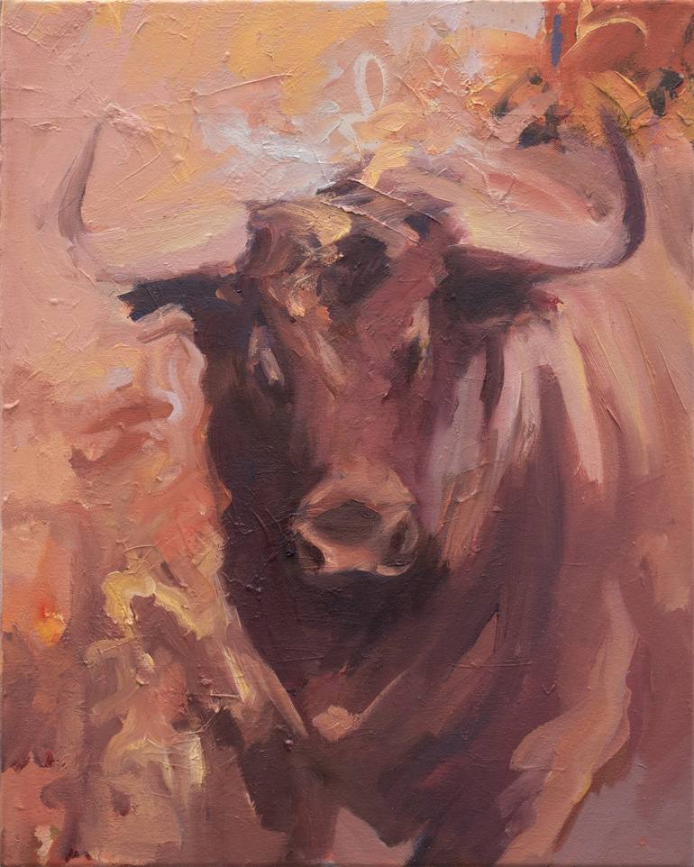 A joyful painting of a young Spanish bull. An implication of flowers in the meadow hints at the Spring.