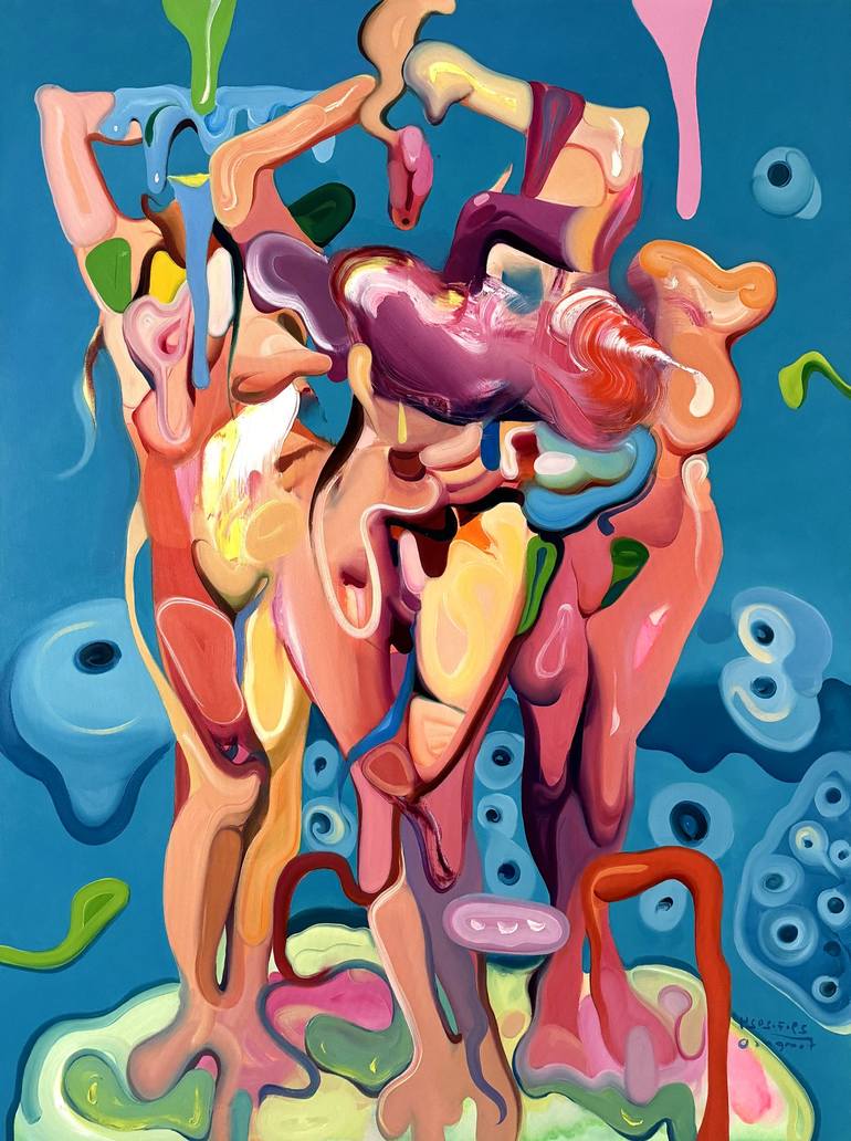 Maxim Fomenko is a contemporary artist born in Russia, known for his vibrant and abstract portraiture. Influenced by modernist masters like Picasso, Francis Bacon, and David Hockney, he brings a playful and provocative twist to their legacy. His paintings often feature distorted faces with surreal elements—like abstract shapes replacing eyes—creating a psychedelic effect that blurs the line between humor and unease. Fomenko’s work explores identity and the human condition, touching on beauty, death, and artistic legacy. His use of bold, often neon colors gives his art a dynamic, modern feel, while the distorted figures invite viewers to question their own perceptions. Though his approach echoes Bacon’s exploration of form, Fomenko offers a lighter, more whimsical interpretation. In series dedicated to figures like Alfred Hitchcock and Picasso, he reflects on celebrity and the inner world of the artist. His “Melting Faces” works highlight the existential struggles of today’s creatives, especially in a world where artistic originality feels increasingly elusive. Fomenko examines the pressures artists face in the shadow of historical greatness and what it means to be a creator today. His work has been exhibited across Europe and is part of major collections, including the Bavarian State Collection in Germany. With bold visuals and thought-provoking themes, Fomenko’s evolving style continues to resonate globally, making him a distinctive voice in contemporary art.