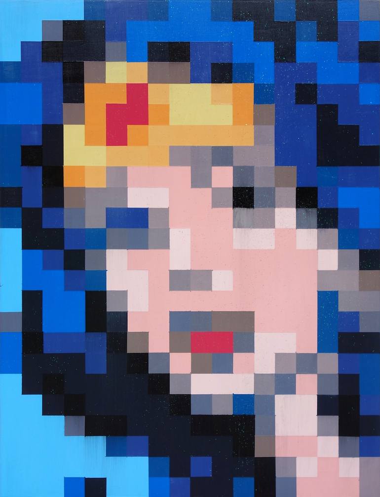 Princess Diana of Themyscira is made with 516 squares (including the sides) using 18 different acrylics on a 24” x 18” wood panel. Ready to hang. No framing required.