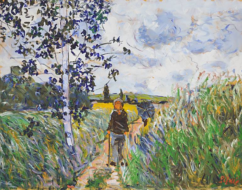Surpris par le mauvais temps, les promeneurs se dépêchent de rentrer avant la pluie. La Normandie est souvent sous la pluie, même en été. Toile réalisée de mémoire en atelier. . ...