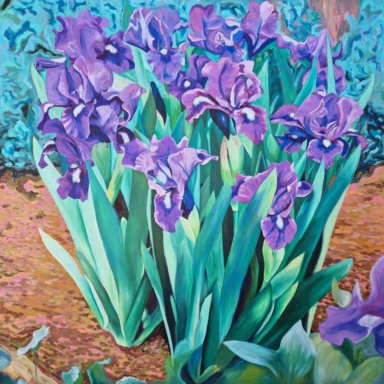This painting captures bright purple irises , the colorful blooms a beautiful contrast against the rich green leaves. The impasto brush strokes are thick and impressionistic, alive with color and movement.