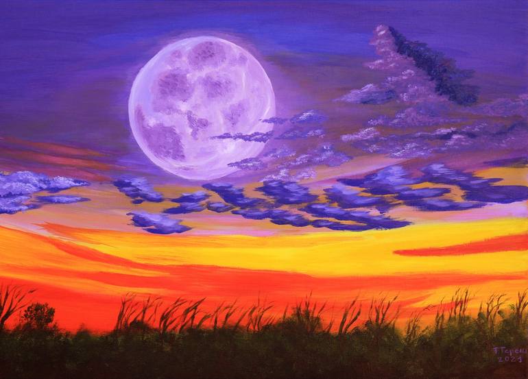 Title: "Purple Moon" Materials: acrylic paints, stretched canvas, brushes, acrylic topcoat Size: 19.7"x27.6"x0.6" ( 50cm x70cm x 1.5cm) Artist: Tetiana Teresh Country: Czech Republic Creation date: 2021 I really like the full moon and the night sky. "Purple Moon" is the fourth painting in the "Full...