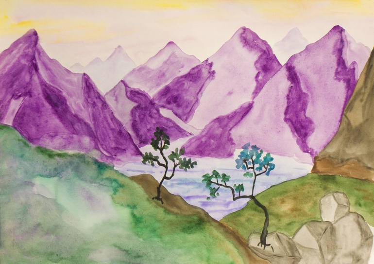 Painting: Watercolor on Paper. Landscape with purple hills.