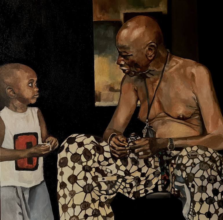 Purveyors of Wisdom is a powerful portrayal of intergenerational connection and the silent transmission of knowledge. The artwork captures an intimate moment between an elderly man and a young boy. The elder, adorned in traditional patterned cloth, sits topless with a weathered but gentle expression...
