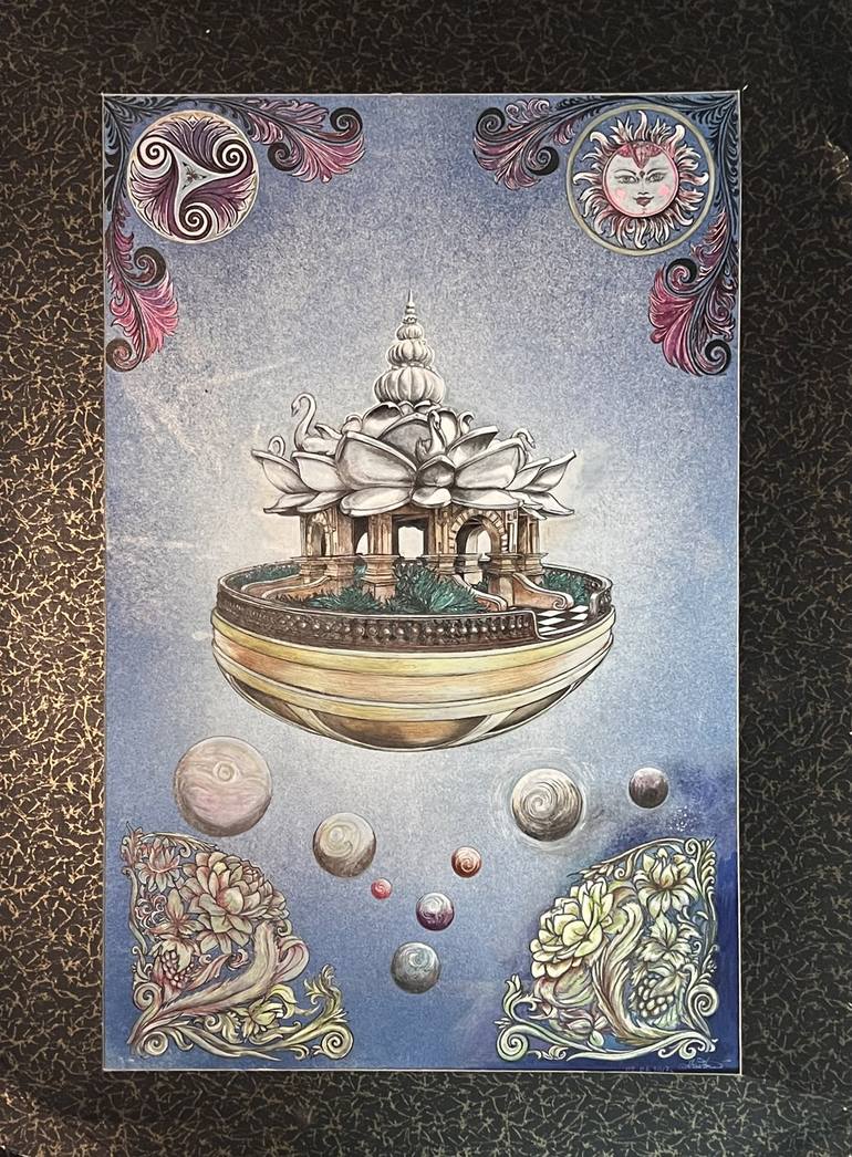 Pushpak's Air Chariot 37 x 56 cm 06/02/2017, Ukraine, Odesa Ink, pen, watercolor pencil, tinted papier-mâché stretched on cardboard. Mixed technique color graphics. Original fantasy style. Together with the NFT, the buyer receives the original paper version of the painting, and secures the right of...