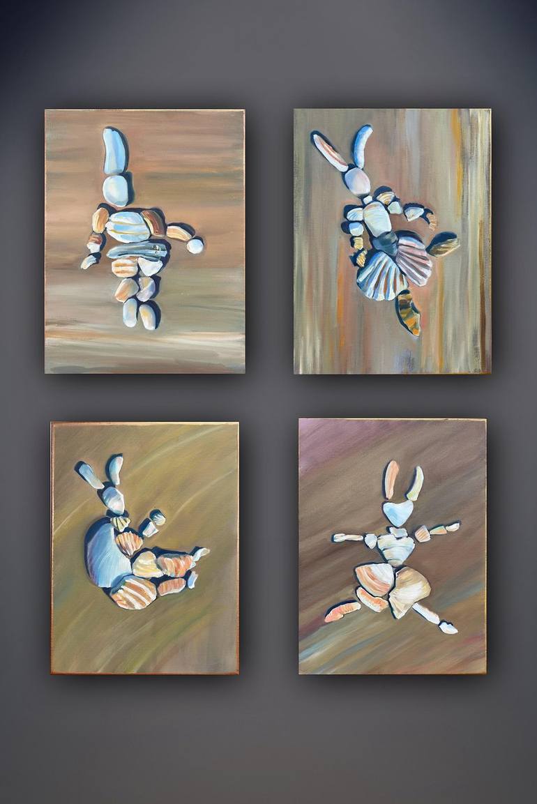 Please note that the size of one block is indicated, meaning that four blocks together will take up a larger area. These four paintings are inspired by the charming hare figures I crafted from broken shells on a beach. I built these whimsical hares while sitting on a wooden beam, enjoying the tranq...