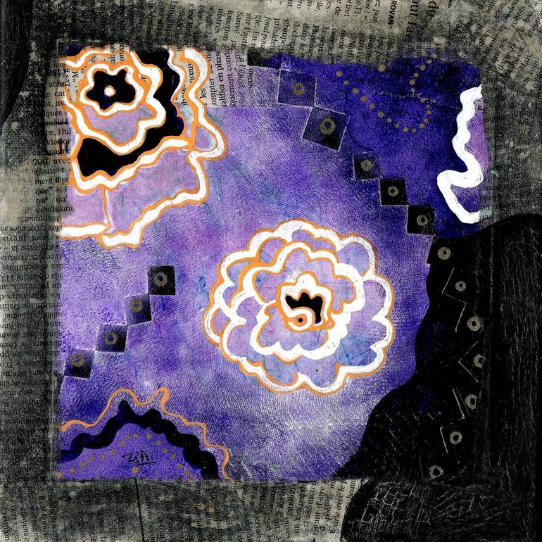 Collage paper, new paper and acrylic paint. Theme : Ornamented with symbolic abstractions or floral figures. Abstracts ornate floral or symbolic figures. This visual world is an overlap between shape and color. Collage papier, journaux,peinture acrylique. Thème: Abstractions ornementées de figures ...