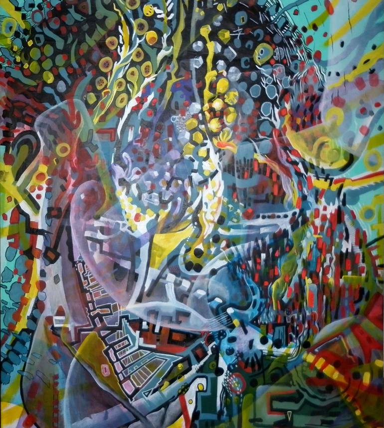 Every artist's work I really like influenced me as I discovered the painting during the process of making it. Layers upon layers of paint was satisfying to create. Although it is an abstract I employed the craft skills I have always thought as an important element in the creation of my work