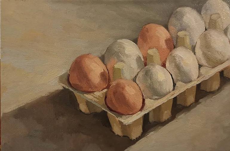 A pack of eggs in colors of brown and white are on a table top, of a shade of dull brown. They are of various sizes, but all are fitted snugly in the carton. The painter has presented another mundane item from the kitchen, given its color, a personality and created this piece. 60732-MO-SDS