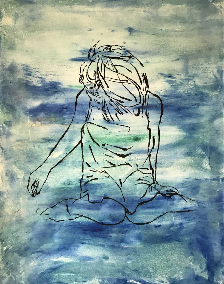 A girl sitting in the clouds. Play in the sunshine- or que sera... painted with pulp, pigments and a special mixture of coffee and pigments to enhance Ease, the joy in daydreaming and the relaxing into life and living