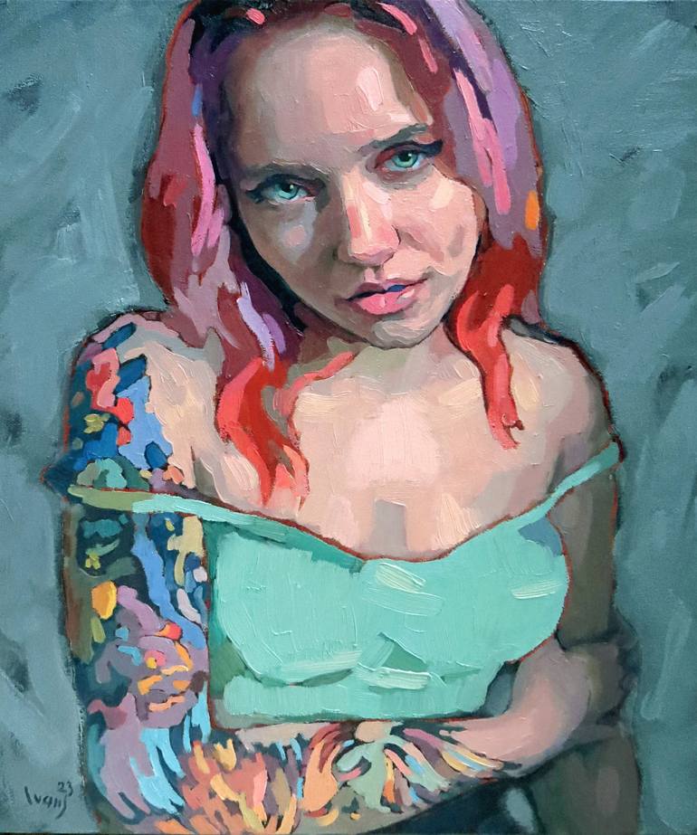 Original contemporary figurative oil painting from live model. "Queen Anne's Revenge" Young red hair girl in underwear lingerie, with fantasy tattoo. Canvas stretched on a wooden frame, and the sides are completely painted, the painting is ready to hang! (No frame or stretching needed.)