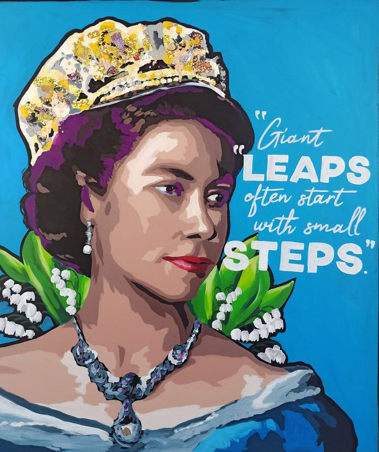 Queen Elizabeth II and one of her famous quotes! I used acrylic paint and recycled fabric and paper, in accordance to my sustainability journey in art.