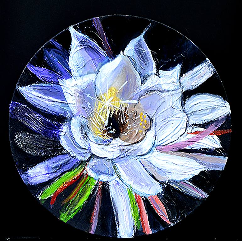 This paint is inspired by a cactus that bloom once a year usually at night. It is an event, a celebration. The cactus originated in Central and South America. Even though it had acclimated here.The timing of it's blooming is in conjunction with the seasons there. Here is the poem that I wrote for th...