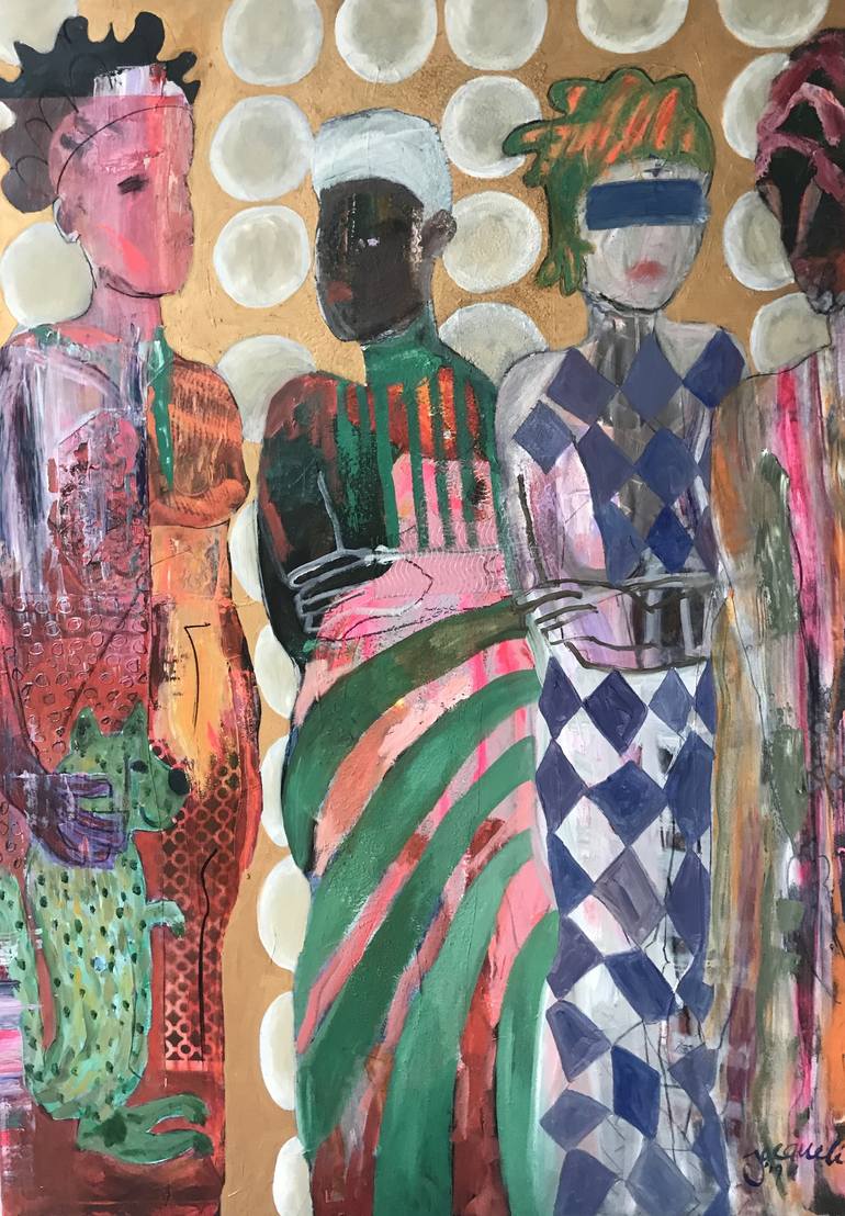 I'm interested in the role of women in the world of today. I think we get a better balance in the world if we use the soft power of women. In my paintings I use powerful colors collage and patterns to express this feeling.