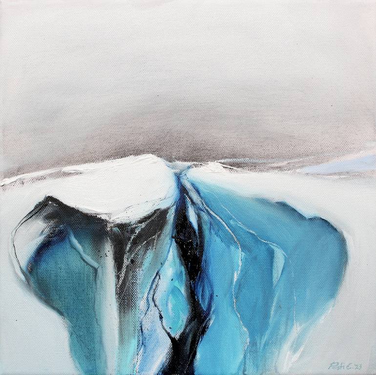 "Quiet Zone 1.1" is an abstract landscape artwork that blends abstraction and expressive gestures. The predominant Prussian blue palette imparts a tranquil atmosphere, echoing Iceland's glacial landscapes with chasms, fissures, and ice. This mixed media composition, utilizing both oil and charcoal o...