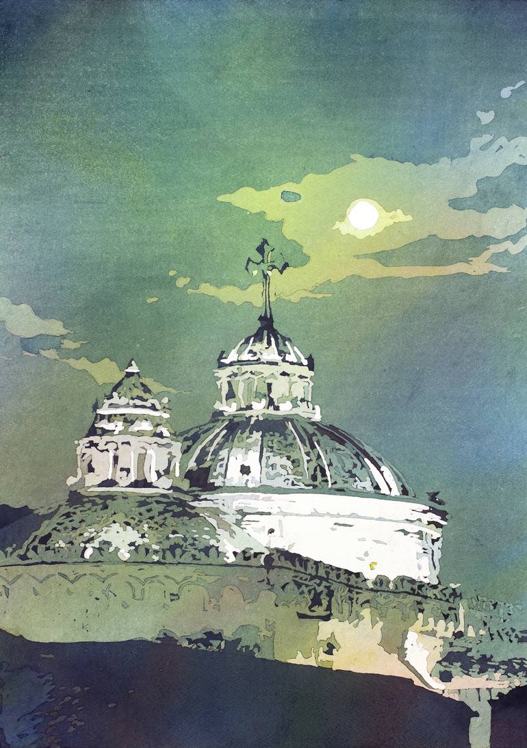 Fine art watercolor painting of church rising over colonial buildings in El Centro of downtown Quito, Ecuador at sunset. Poured watercolor painting on 300lb professional watercolor paper. Hand signed by artist (not pictured). Mounted on black foam core w/ black wood frame and plexiglass. Ready t...