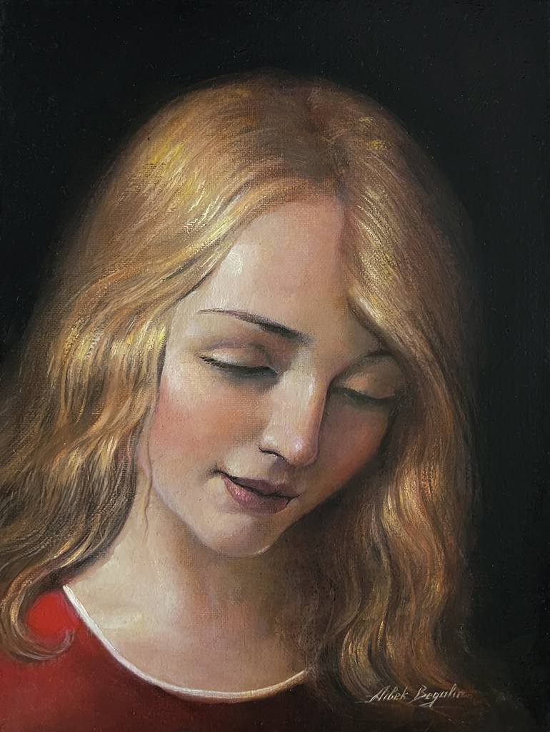 ARTIST: Aibek Begalin WORK: Original oil painting, handmade artwork Medium: Oil on canvas panel YEAR: 2022 STYLE: Realism SUBJECT: RED ANGEL SIZE: 12" x 9" x 0,2" inch Unframed RED ANGEL Red is the color of life, love and sacrifice. The angel is drawn in a classical style, according to the old tech...