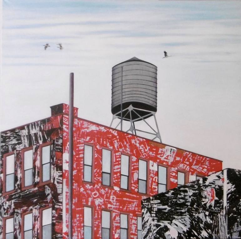 NewYorkCity inspired me...very simple view with water tank i add some paper collage on the building to give it a depth and matiere..some birds too...