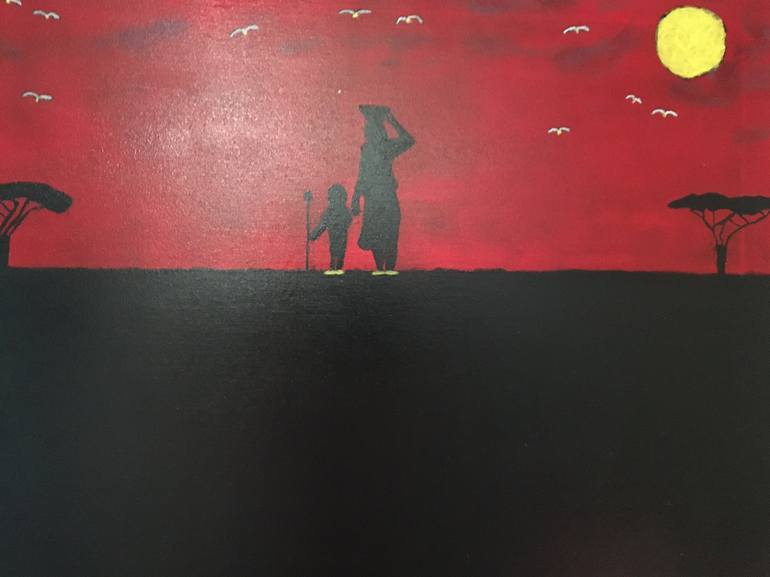tableau de peinture Acrylique représentant une maman et son petit garçon qui marche dans la savane elle porte une cruche d eau sur ça tête