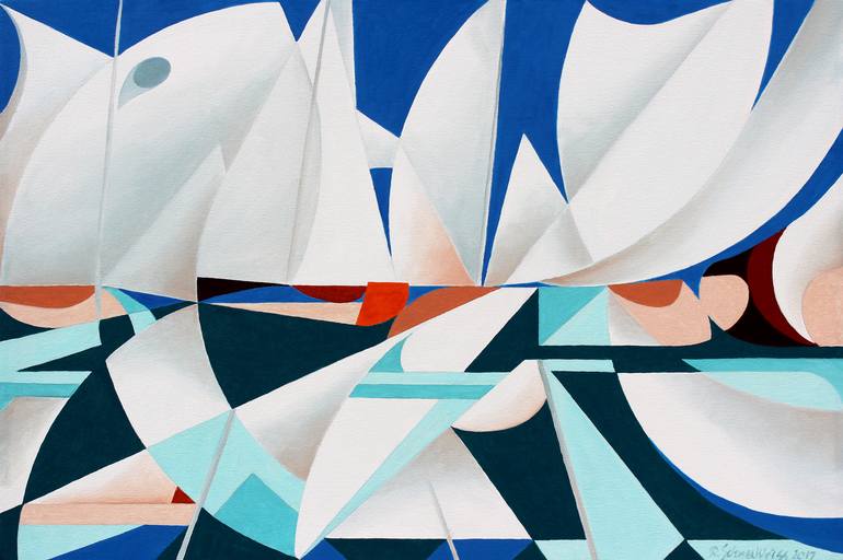 Symbolic perception of sailing boats on the ocean replacing elaborate and complicated images into one line, dot and color. Colorful, playful beauty of this scene soothes anyone eye.
