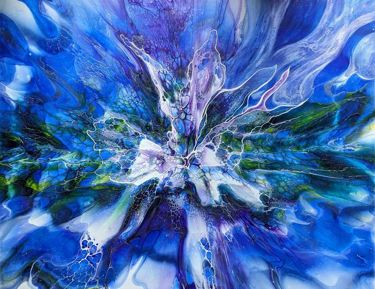 Ultramarine blue and iridescent purple, with touches of green/yellow, with a beautiful central design and beautiful lacing, for this large format canvas. Don't hesitate to check out a video of the canvas on my Instagram account to get a better idea of the subtleties of certain colors. Glossy varnis...