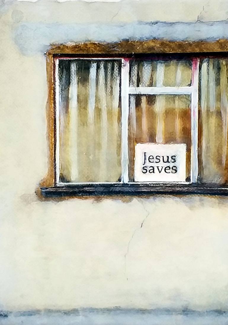 "RUSTING PRAISE" This is a window including decoration of a ghanaian christian community center in Hannover. It seemes quite decayed and I asked myself if religion is as decayed as the window/house. Hannover, 2020 painting acrylic on paper dimensions 42cm x 30cm signed & dated