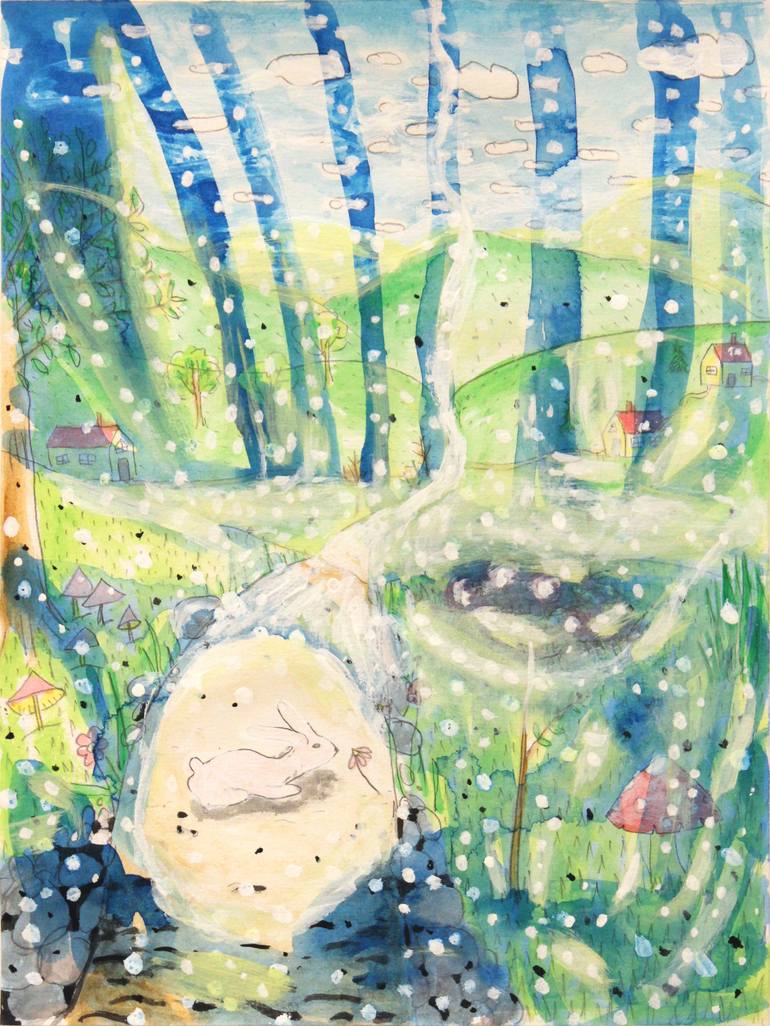 Rabbit Smelling a Flower, acrylic and pencil on paper, 12 x 9 inches, 2019
