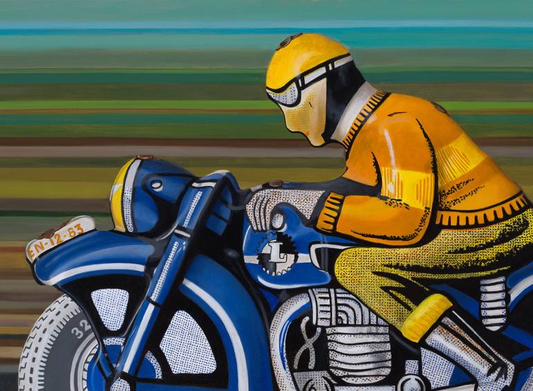This dynamic oil painting captures a vintage motorcycle racer leaning into motion against streaked countryside colors that blur past in horizontal bands of green, blue, and golden earth tones. The rider, rendered in meticulous photorealistic detail, wears a distinctive yellow and orange racing suit ...
