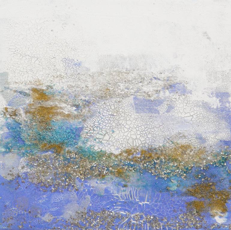 Radiance is an original painting, created with acrylic paint on gallery-wrapped canvas. It has a width of 6 inches and a height of 6 inches with a depth of 1.5 inches (6x6x1.5). The colors used in this painting are periwinkle blue, white, teal, and iridescent, metallic gold and silver. There are sp...