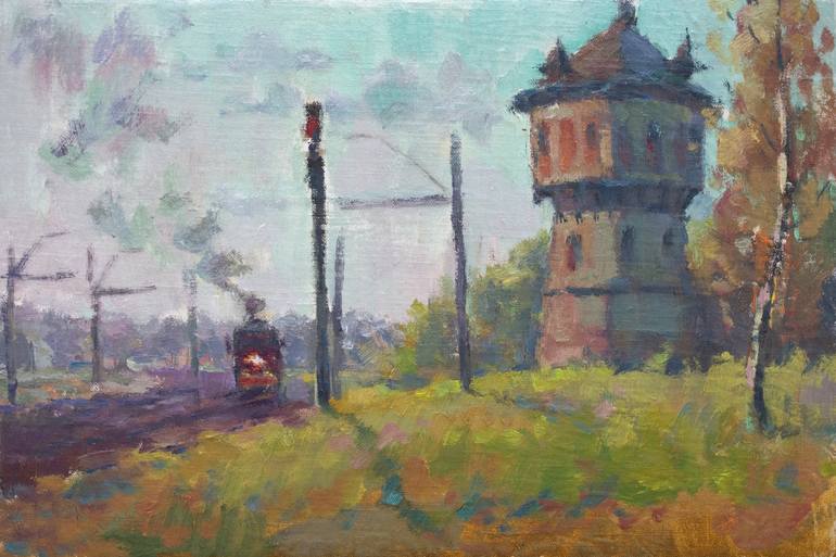 We see the railroad and the train, which rides in front and shines a lantern. On the right is an old water pump, part of the greenery. And all this is shrouded in autumn colors. This part of Riga is reminiscent of the old industrial Riga of the late 19th century. Then Riga developed rapidly. And its...