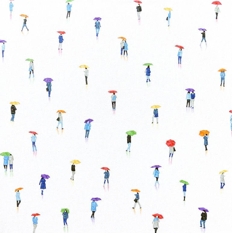 In this series of paintings, Stephanie remains faithful to her interest in observing human activities in the metropolitan city life and fascination in the silhouette of the human figures. Inspired by the gloomy English weather, the palette chosen in Rain-Bow 17 create a contrast to the melancholy f...